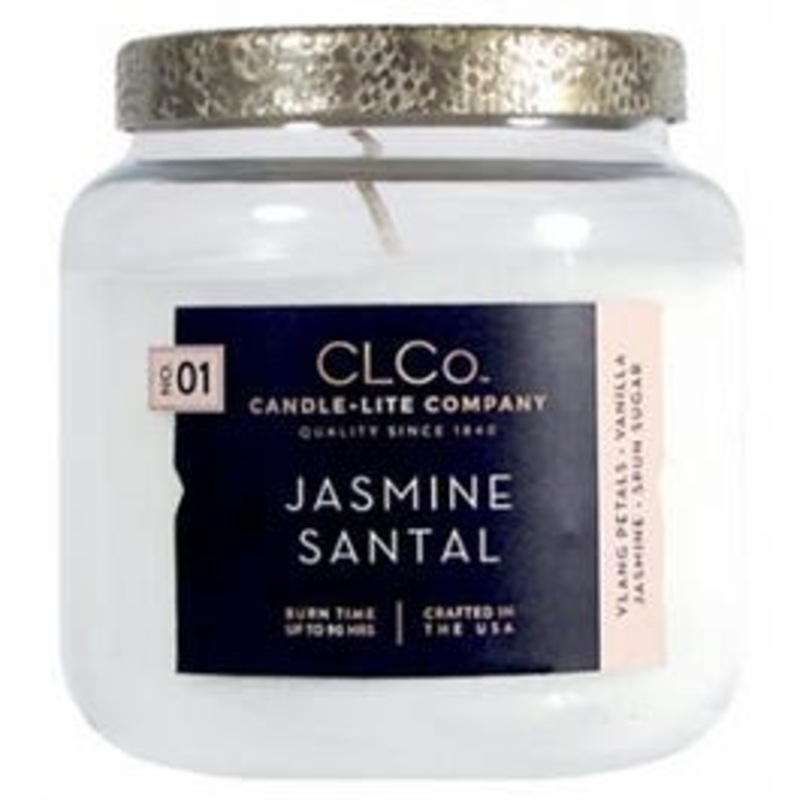 Clco, 14 oz, jasmine santal candle, consists of white paraffin wax, clear glass jar with a textured metal lid, uniquely fragranced & designed to capture the attention of millennials, burn time is up to 90 hours.