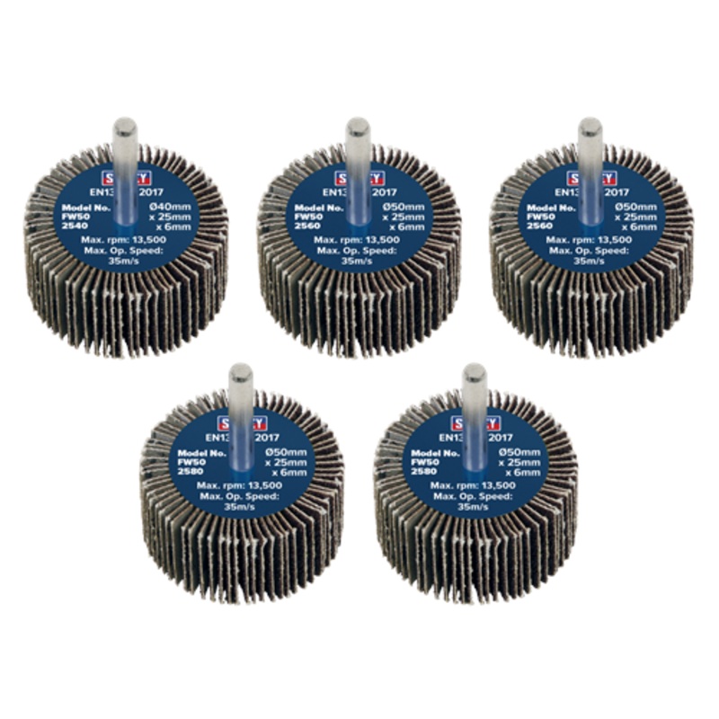 Sealey Abrasive Flap Wheel 50 x 25mm 6mm Shaft Assorted Grit – Pack of 5