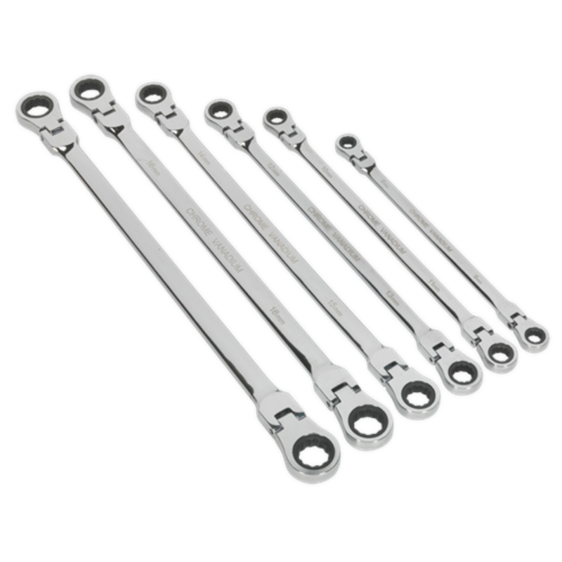 Sealey Premier Flexi-Head Double End Ratchet Ring Spanner Set 6pc Extra-Long Metric