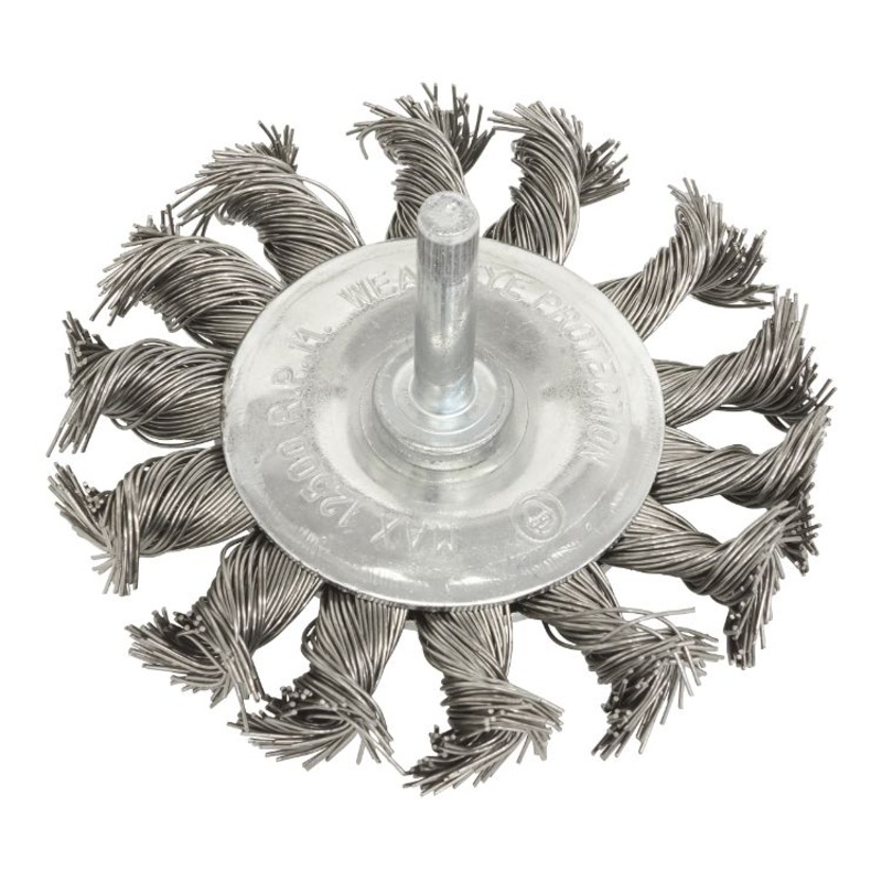 Twist knot flat wire wheel.Stainless Steel.Shaft: 6mm.Width: 75mm.Max Speed: 12500rpm.