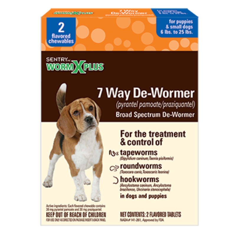 SENTRY HC WORM X PLUS 7 Way De-Wormer for Puppies & Small Dogs treats and controls: two tapeworms (Dipylidium caninum and Taenia pisiformis), two roundworms (Toxocara canis and Toxascaris leonina) and three hookworms (Ancylostoma caninum, Ancylostoma braziliense and Uncinaria stenocephala). It contains two active ingredients found in veterinary brands: pyrantel pamoate and praziquantel. This de-wormer comes in flavored chewables, making it easy and convenient to give to your dog. Intended for puppies and small dogs weighing 6 to 25 lbs.