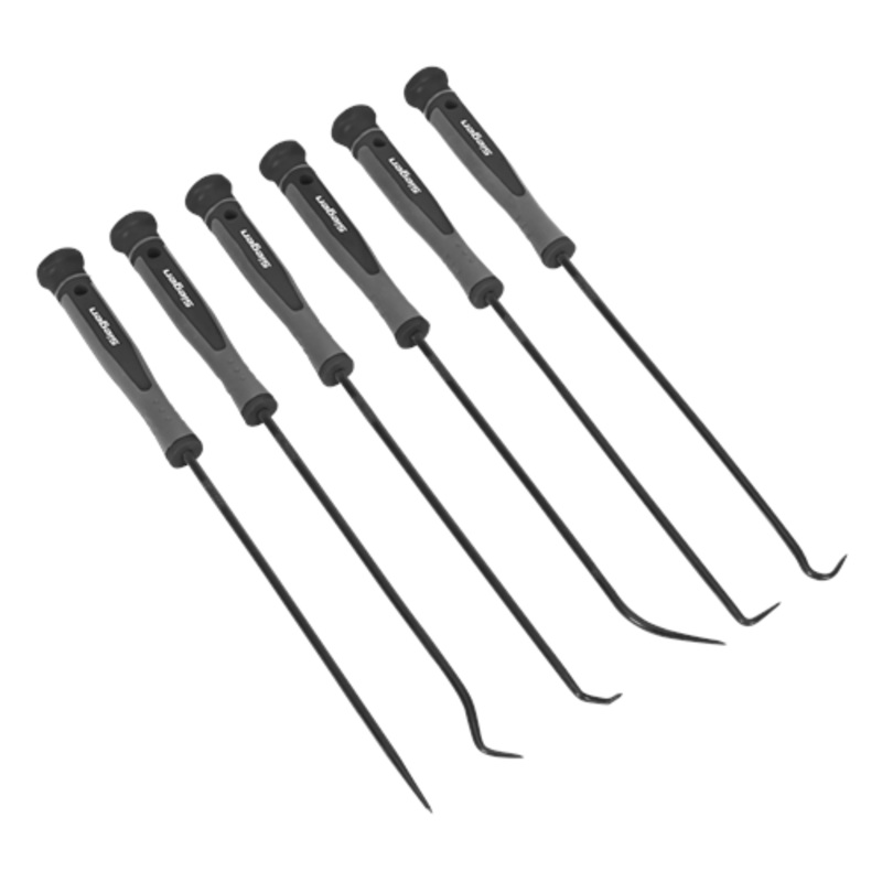 Six long reach picks with black finished steel shafts. Suitable for pin/clip picking and the removal of O-rings and seals.
