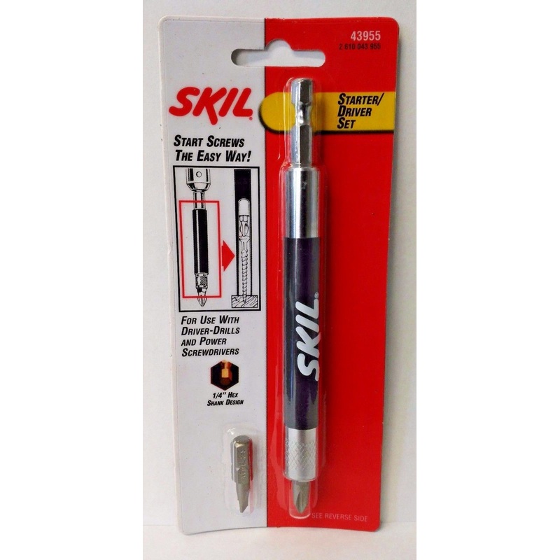 Skil 5" Magnetic Screw Starter Driver Set 43955 Starts screws the easy way For use with driver drills and power screwdrivers 1/4" hex shank Makes starting the screw eas holds the cscrew in correct starting position. Outer sleeve slides over the screw and k