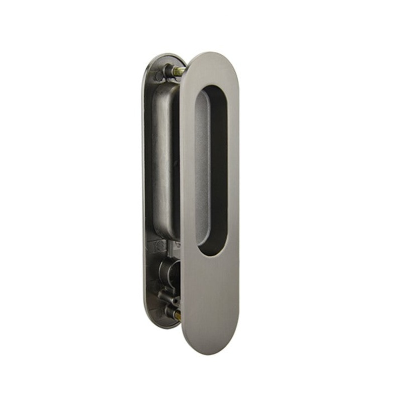 DescriptionRounded rectangle-shaped faceplate with the flush pullA pair of 173mm x 45mm flush pulls (back to back)Alloy zinc construction with brushed gunmetal finishFace plates designed to sit flush with doorto allow the door to completely slide into the
