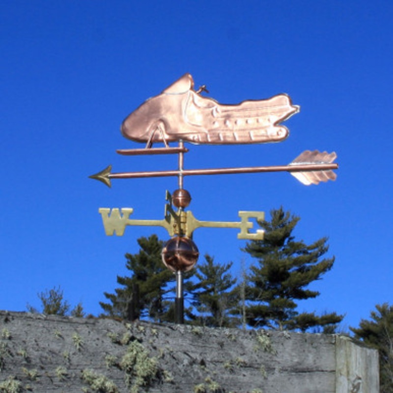 This weathervane is made here in Eddington Maine by hand hammering it into a form using 16oz copper/ 24 gauge. This weathervane is real copper and will turn brown, black and then a green patina over time. If you choose to keep the weathervane shiny, you can always apply a clear coat of exterior poly urethane over the weathervane figure and weathervane parts to keep it from changing. Our main Weathervane Retail Shop is located in Trenton Maine on route 3 headed towards Bar Harbor and Acadia National Park. Made in Maine.