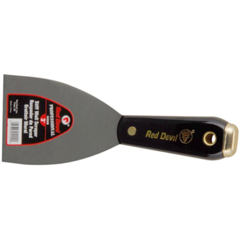 Professional quality wall scraper. Black nylon solvent-resistant handle. Has high-carbon, precision-ground steel blade lacquered to prevent rust. Brass plated, solid steel nail setting head. Can also be used as a spackling knife. Width 3".