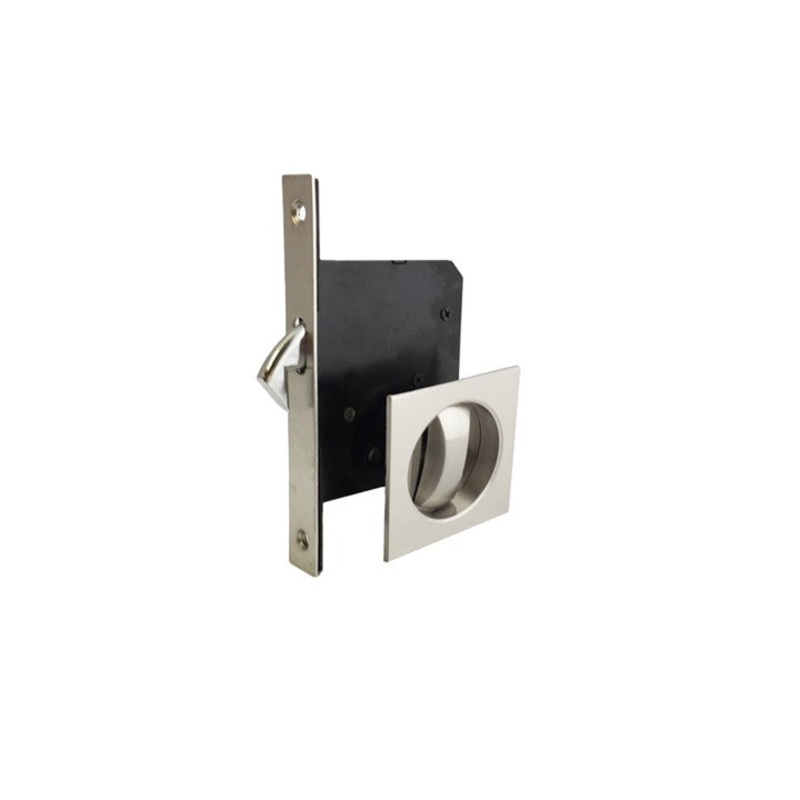 - Square shapedsliding door privacy set with satin nickel finish (looks like brushed stainless steel finish)