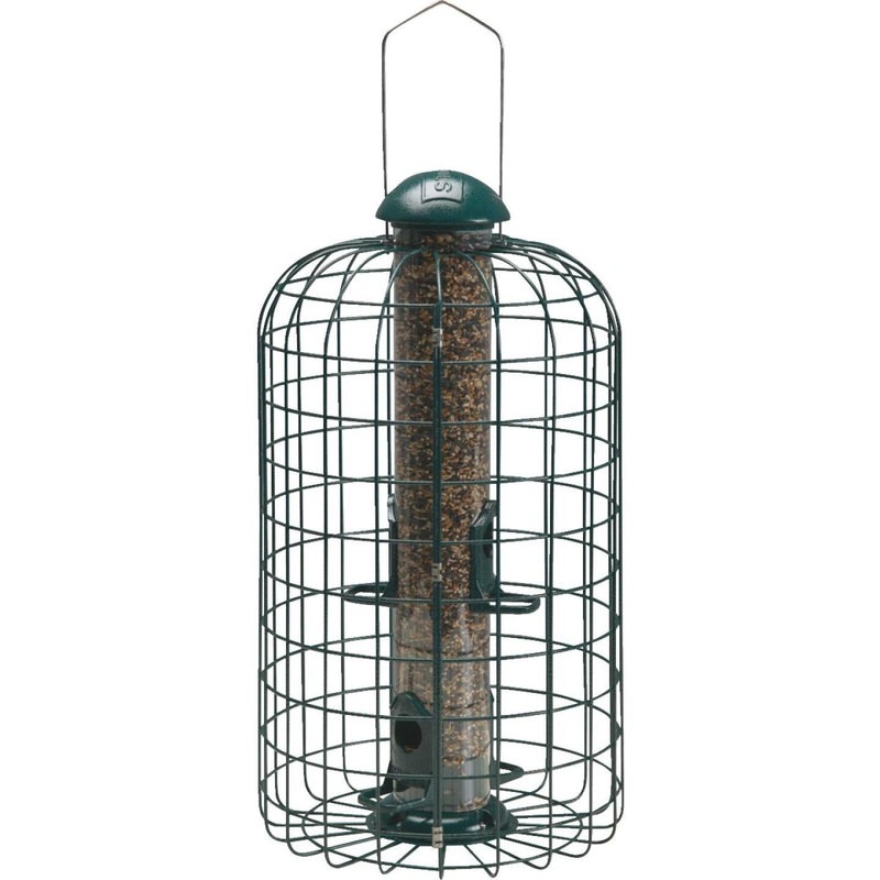 Powder-coated wire cage allows birds to feed from 4 feeding stations but keeps squirrels and undesirable birds out. Lock-on handle prevents squirrels from lifting lid. Seed capacity: 1 lb. classic mix.