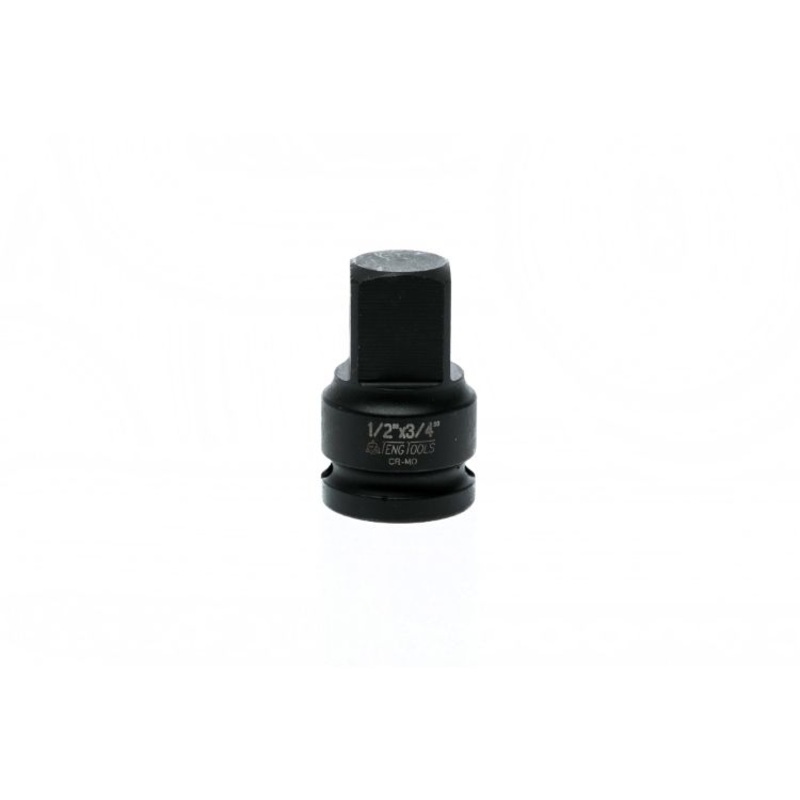 1/2" drive to 3/4" drive impact adaptorEnables the use of 1/2" drive air guns and accessories with 3/4" drive impact sockets, etc.DIN standard design for use with a retaining pin and ring Chrome molybdenum for use with power toolsRing and pin fixing hole o