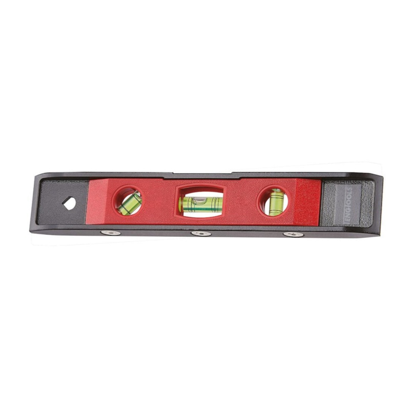 An impact resistant black aluminium 230mm torpedo style spirit level with three metal magnets on the underside for fixing to ferrous work pieces (steel, etc)Crush proof, durable tubular vials with high transparency for easy reading including 45 angle bubbl
