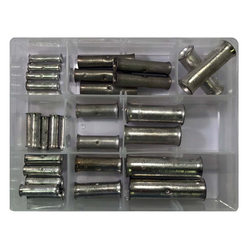 This 30-piece assortment of tinned copper butt splices includes a full range of large gauge connectors, ideal for heavy-duty automotive, marine, and industrial applications. Designed for high-current connections, each butt splice offers corrosion resistanc