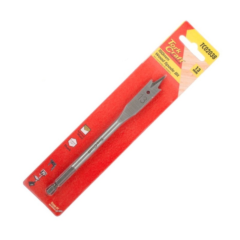 Wood spade drill bit - StandardDiameter:13,0mmWorking length:150mmShank:6,35mm hex for quick changeA spade drill bit is used for rough boring in wood.Spade drill bits can be used to drill in:Hard woodSoft woodChipboardMDFPlywoodManufactured from High carbo