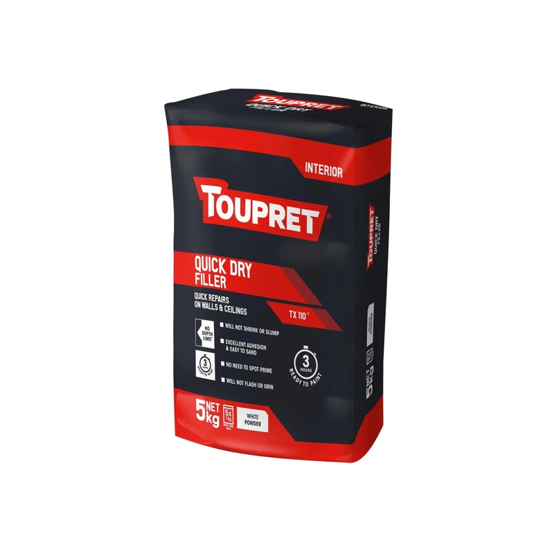 TOUPRET Quick Dry Filler for interior surfaces can be overcoated in 3 hours with any conventional paint or wallpaper . It can be filled to any depth without shrinking and offers exceptional adhesion with excellent shaping qualities. It's easy to sand and i