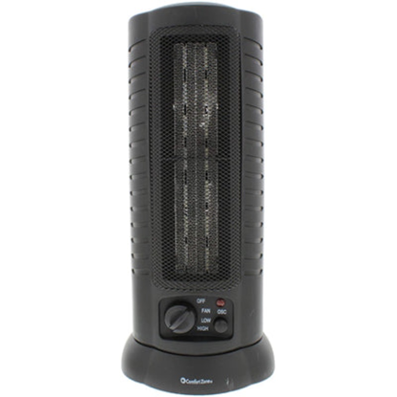 Oversized ceramic PTC heating element. Two heat settings and fan-only setting. Safety overheat protection system. Adjustable thermostat. Safety tip over switch. Power indicator light with four position rotary switch controls: OFF, LOW, HIGH, FAN ONLY. 80 O