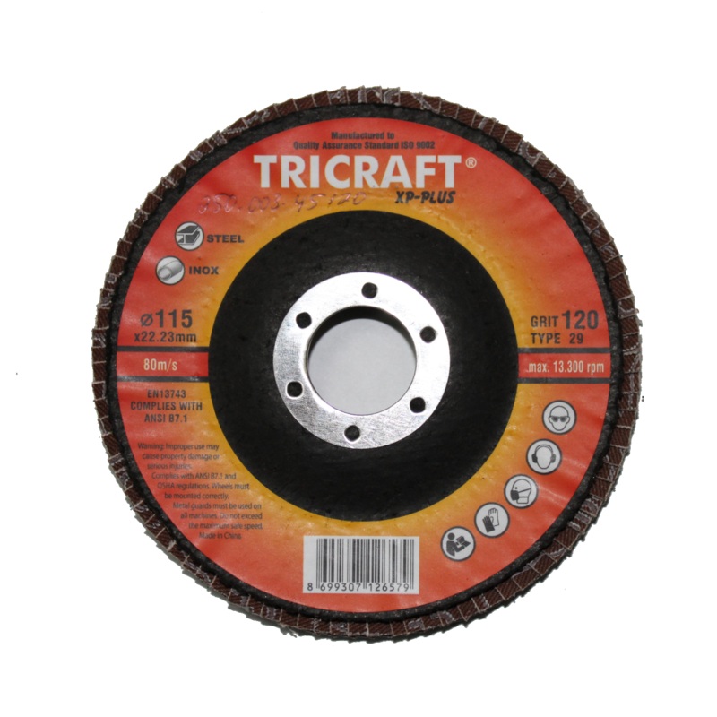 Tricraft 4-1/2'' x 3/8'' Type 29 , Grit 120TRICRAFT Simi-flex Grinding disc, for coarse grinding work with high stock removal and long tools life, the high-performance abrasives delivers the best results at increased contact pressure.Made out of ALIMINIUM