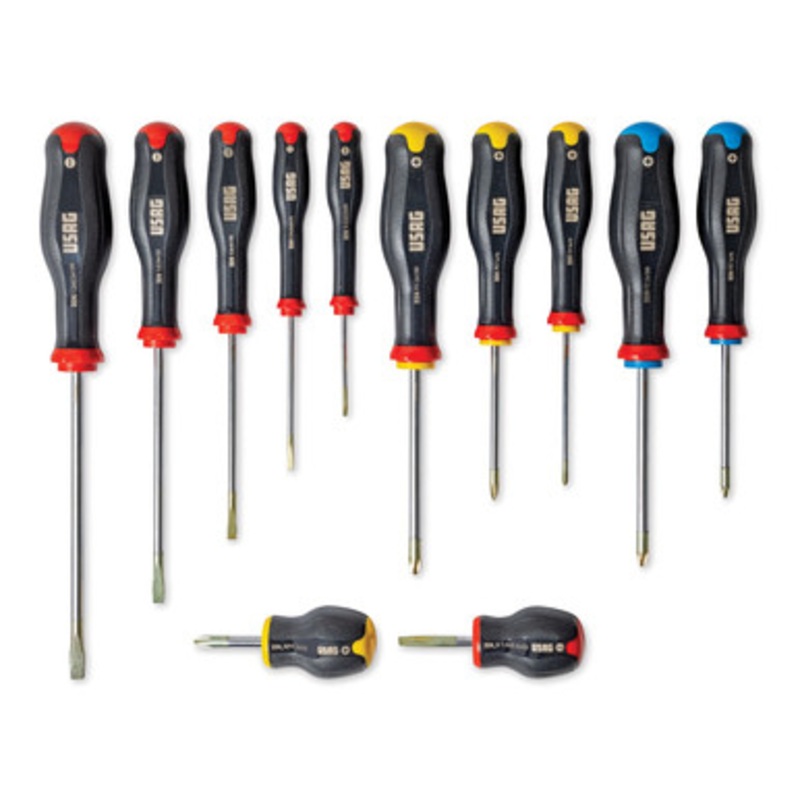 Lay down the torque with this quality set of a dozen screwdrivers designed for slot-head, Phillips, and POZIDRIV fasteners.