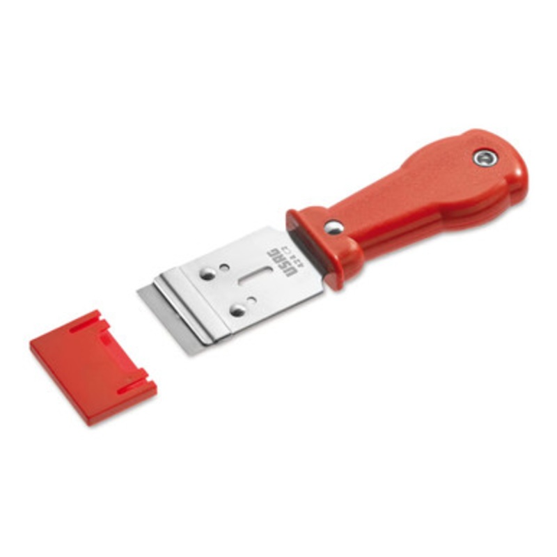 This quality scraping tool features a durable stainless steel body wrapped with an ergonomic plastic handle.Works great for decal removal and other cutting/scraping needsReplaceable blade measures 1 1/2" in widthBlade thickness is 0.3 mmTool measures 6 1/4
