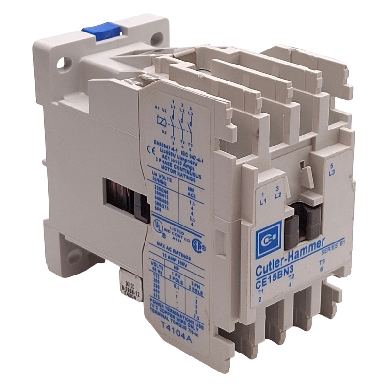 From our inventory we are selling a Cutler-Hammer CE15BN3 Contactor, 3-Pole, 10A, 7.5HP @ 575VAC, 24VDC Coil.