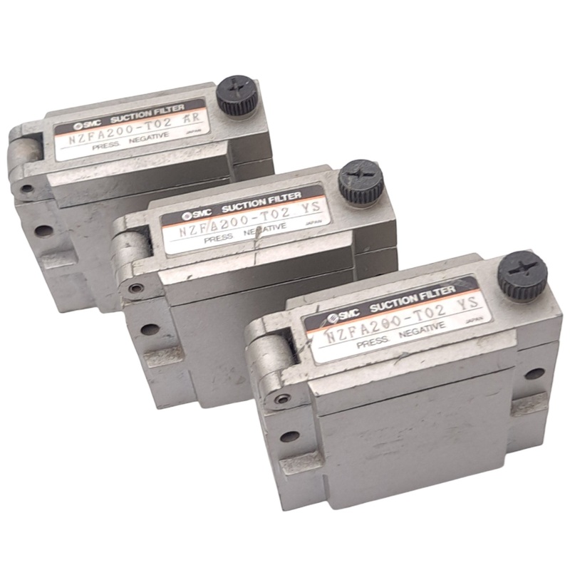 From our inventory we are selling a Lot of 3 SMC NZFA200-T02 Suction Filters, 30m Filtration, 1/4in NPTF, -12 psi.