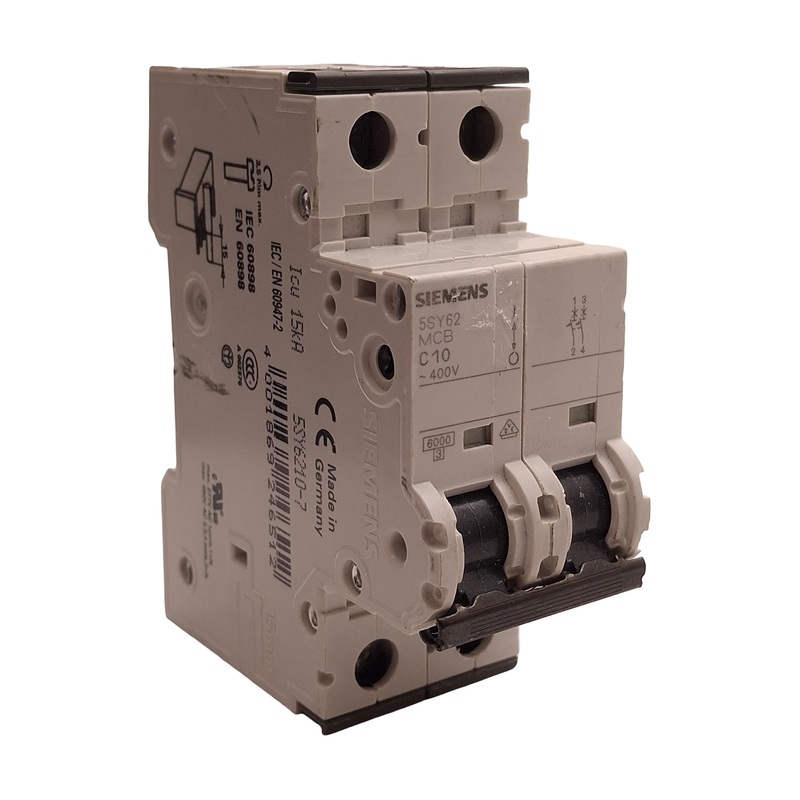 Used Siemens 5SY6210-7 Circuit Breaker, 2-Pole, 10A 400VAC, C-Curve, DIN Rail