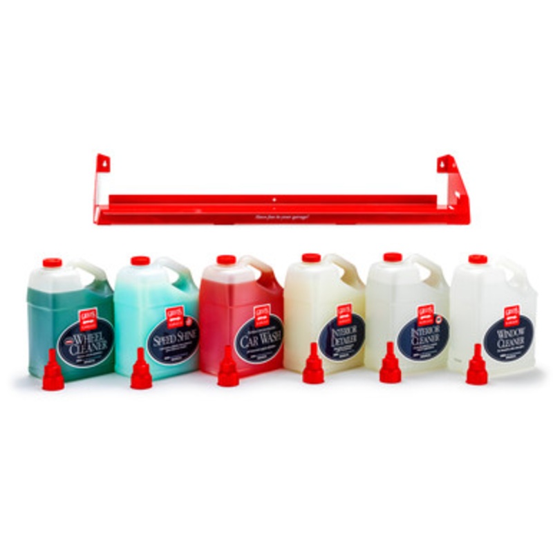 Efficiently store these top selling gallons with our sturdy wall-mounted utility shelf. Gallons of your favorite interior, tire & trim, glass, and paint care Includes Dispensing Spouts for easy, spill-free refilling Large 33.26" wide by 13.5" deep shelf su