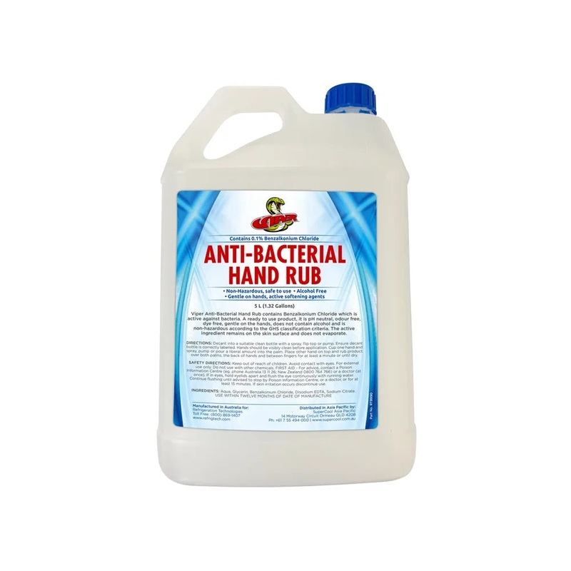 The Viper Hand Rub Sanitiser 5L bottle is a ready-to-use alcohol-free product compatible with any conventional household trigger sprayer. It kills more than 99.9 per cent of bacteria and is ideal for use on children, near food, plants and pets.Viper Hand R