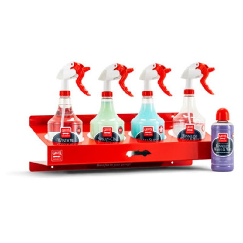 - Rack holds 4 of our favorite rinseless wash and quick wipe down geared products