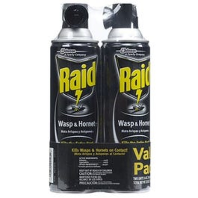Raid, 2 Pack, 14 OZ, Wasp & Hornet Killer, Aerosol, Kills Wasps & Hornets On Contact From 25', Kills In Seconds, Residual Action Kills Wasps & Hornets That Return To The Nest, Kills Larvae & Pupae In Nest.