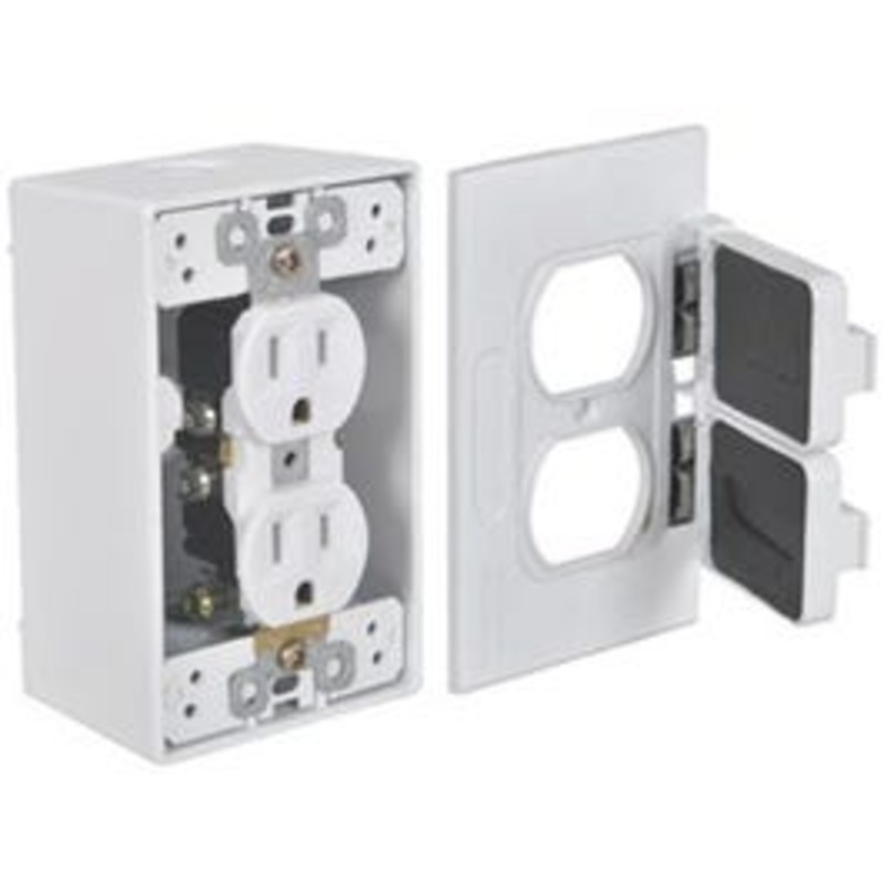White, Duplex Outlet Kit, Contains 15A 125V Receptacle, Rectangular Box, Cover & Accessories.