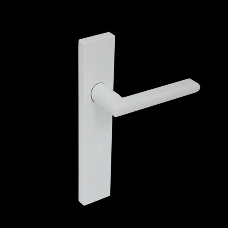 DescriptionSolid slim profile door handle mounted on a long rectangular face plateFace plate 42mm wide x 200mm longSolid zinc alloy construction with a pure white finishSuitable for both left and right-hand opening doorsSuitable for door thickness from 35m
