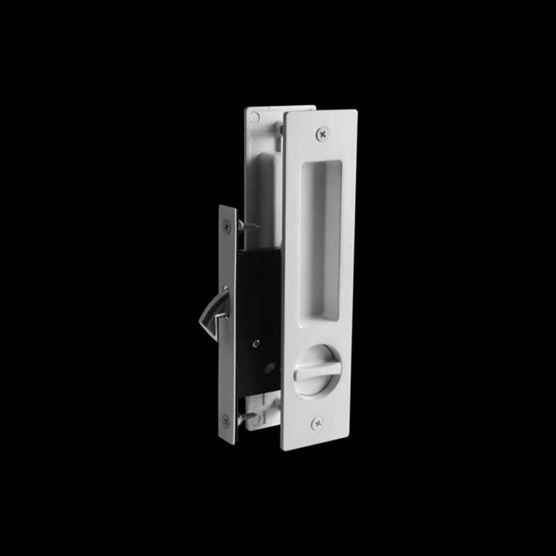 DescriptionWhite Finish privacy set with 180mm x 45mm faceplateFace plates designed to sit flush with doorto allow the door to completely slide into the wall cavityTwist snib lock inside and emergency opener outsideAlloy construction with matt white finish
