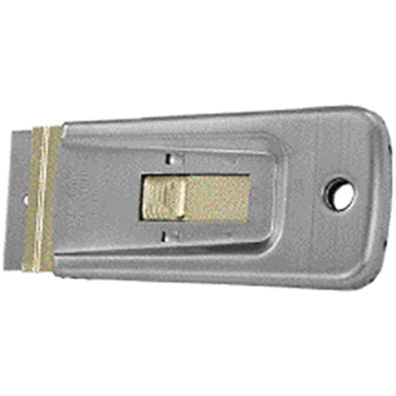 Removes paint, glue, putty, or adhesives from glass, tile, walls, floors, or other smooth surfaces. Retractable blade. Uses standard single edge razor blades (5 included). Length 3-3/4". Carded.