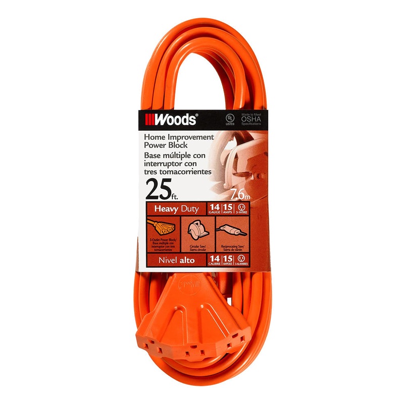 Woods outdoor tritap extension cords come with a tritap, making them perfect for a variety of outdoor applications.Ideal for appliances and power toolsCommon Applications: Electric Push Mower, Hedge Trimmer, Electric DrillTritap for power distributionHeavy