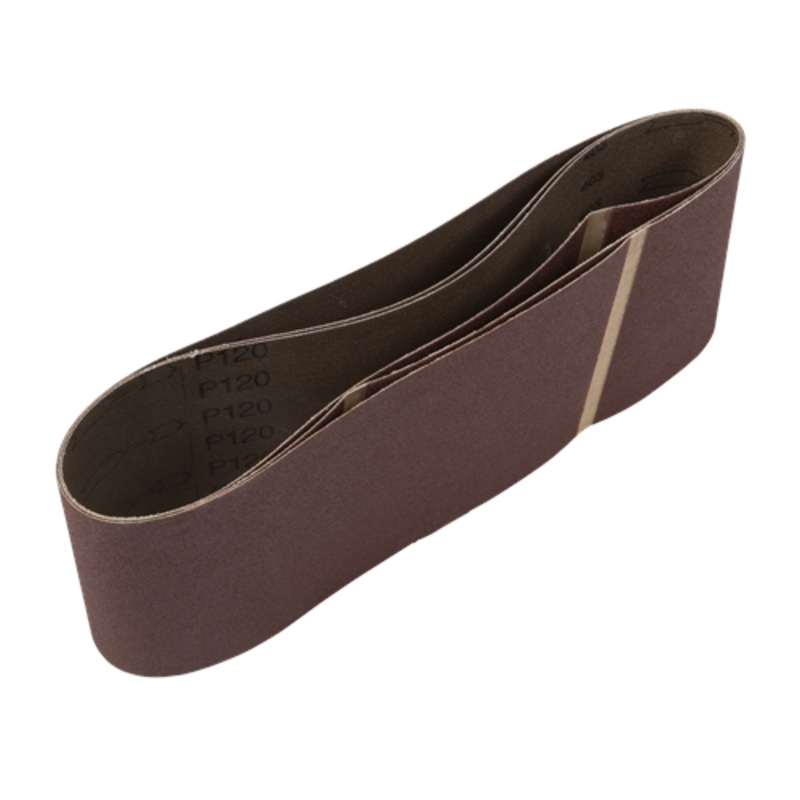 Hard-wearing sanding belt suitable for wood, paint, filler and metalwork applications. Ideal for quick stock removal and finishing with a strong cloth backing. 120Grit. Supplied in pack of 3.Hard-wearing sanding belt suitable for wood, paint, filler and me