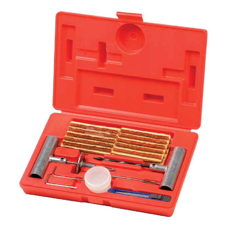 • Tire Repair Kit with 4″ tire string inserts and a Heavy Duty Hollow Metal T-Handle reamer and insert tool