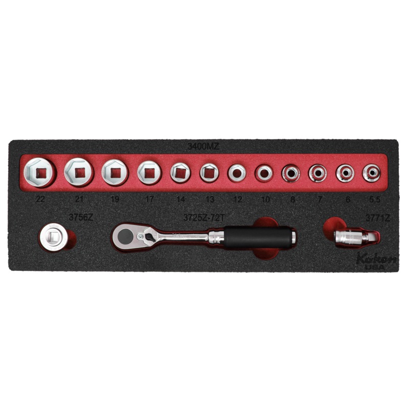 Input Drive Size:3/8"Drive Shape:SquareFoam Length:377mmFoam Width:127mmFoam Thickness:30mmIncludes:Don't need the complete set?Click here to buy items individually3400MZ Z-Series 6 Point Sockets5.5, 6, 7, 8, 10, 12, 13, 14, 17, 19, 21, 223725Z-72TReversib